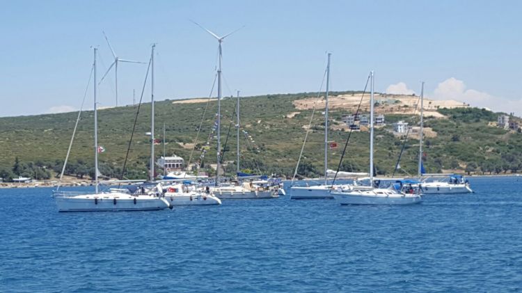 Ağır yolla Teos marinadan çıkıyoruz. Her taraftan kornalar , alkışlar, el sallamalar, bağırışlar büyük bir gürültü var. Bizde elimizdeki kornalar ile bu gürültüye katkı sağlıyoruz. Etrafımızda 3 adet palamar botu dört dönüyor (sağ olsun palamarcı arkadaşlar yıllardır bizim zahmetlerimizi çekiyorlar) . Çevremizde onlarca yelkenli yola çıkışımızda bize eşlik ediyor. Sığacık Killik burnuna kadar tekneler bize eşlik etti ve ben herkese işaret edip artık geri dönmelerini söyledim.