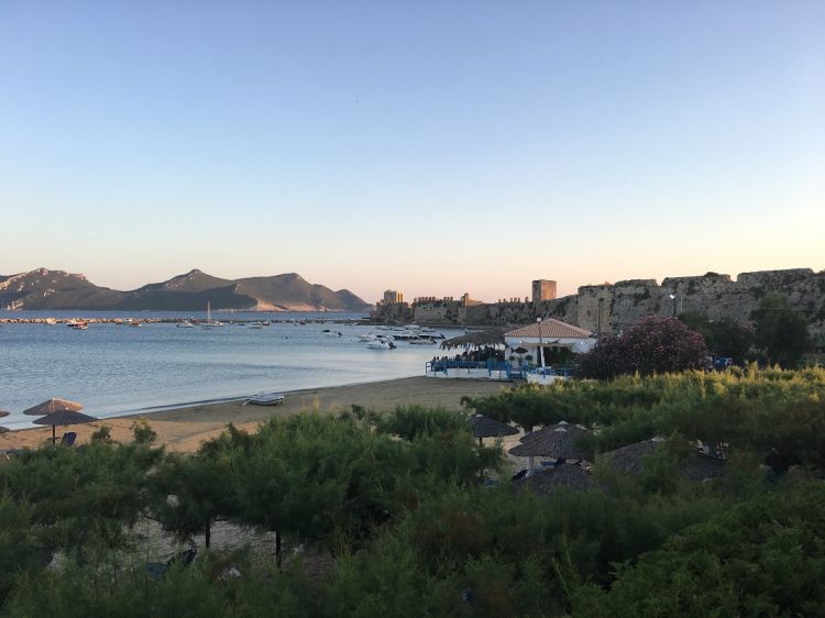 Methoniye gelir gelmez tüm güzelliği ile Türk Kalesi bize merhaba diyor. Burada yanaşacak bir iskele yok ve bu beni çok memnun ediyor. 3,5 metre kum zemine çapamızı atıyoruz. Her zaman ki gibi bolca kaloma verip.Etrafı dürbün ile izlemeyip neyin nerede olduğunu anlamaya çalışıyorum. Deniz burada pek cezbedici değil. Çok temiz ama dipteki kumun rengi sebebiyle bizi pek çağırmıyor. Dedim ya biz tekneciler biraz şımarığız diye. Akşam üstü karaya çıkıp köyün sokaklarında şöyle bir turluyoruz. Birkaç fotoğraf çekiyoruz.