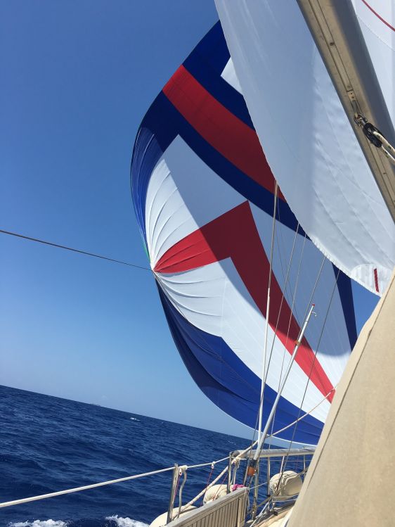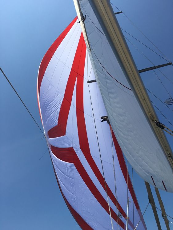 Bu balonu ikinci el olarak yeni aldık ve kullanmasını hiç bilmiyorum. Deneye deneye öğreneceğiz. Bizim tekneye biraz küçük geliyor. Sanırım 39 feet tekne için yapılmış. Bu ufak balon bizim acemiliklerimizi sanırım tolere J eder. Yaklaşık yarım saat kadar basılı kaldıktan sonra rüzgar açısı daralıyor ve asimetrik balonu indirip Code Zero yelkenimizi takıyoruz.