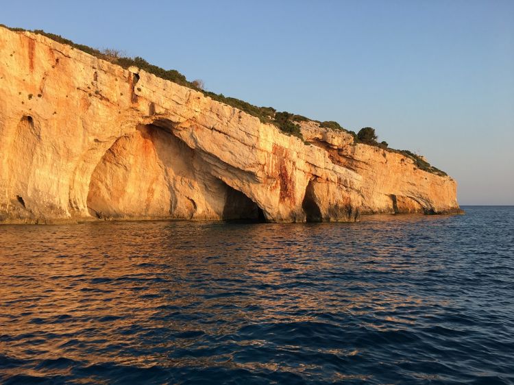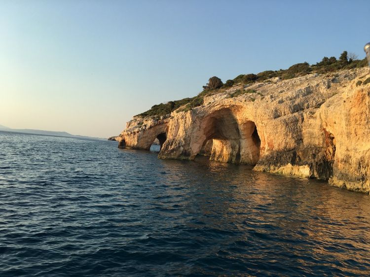 Zakinthostan sabah 06.00 da ayrıldık. Niyetimiz Kalabalık olmadan Blue Cave denilen mağaraları görmek. Bulunduğumuz limandan buraya ve batı taraftaki Ships Wreck’e çok yoğun bir tur teknesi trafiği var. Birde üstüne Zakinthos ana limandan kalkan 100 – 200 kişilik balık istifi günlük gezi tekneleri de eklenince tam bir kaos oluyor diye düşünerek sabahın köründe tek tekne olarak Blue Cave ‘yi keyifli bir şekilde kahvemizi içerek seyrettik. Aslına bakarsanız çok da güzel ve mühim oluşumlar değil ama adada  başka bir şey olmadığı için bu iki yeri büyütüp duruyorlar. Altta size iki foto ekliyorum. Benim dediklerimi boş verin kararınızı kendiniz verin.