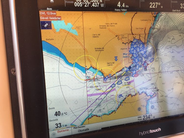 Biz İspanya anakarası tarafından yani gemi trafiği tarafından gelmediğimiz için fark etmemiştik ama tam Gibraltar burnunu dönünce her tarafın gemilerle dolu olduğunu görüyoruz. Bunun nasıl bir şey olduğunu anlamanız için benim chartplotter ekranımın resmini çekiyorum. Mavi gördüğünüz işaretler duran ve hareket halinde olan gemiler.
