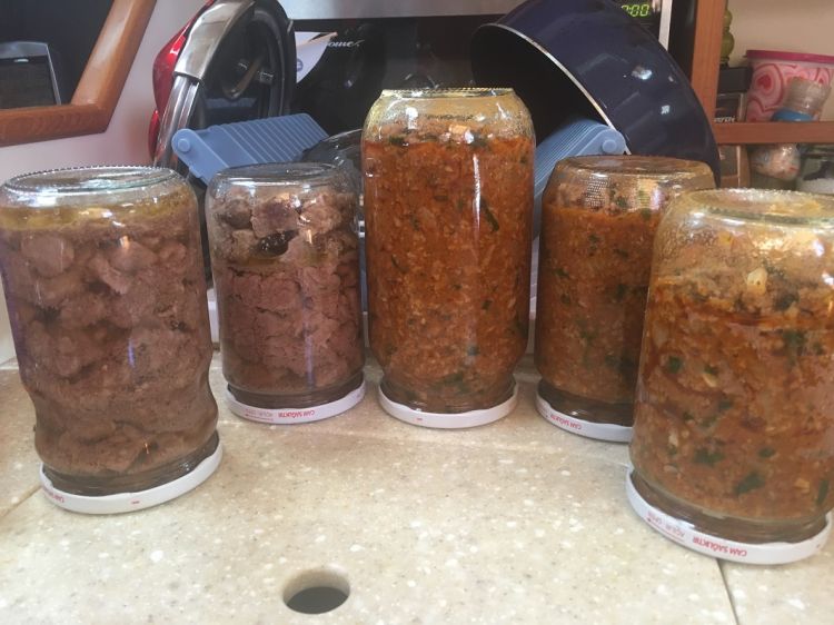 Ebru seyire çıkmadan marinada bir çok yemeğin alt yapısını hazırladı.Etleri kavurdu ve bolca karnıyarık içi hazırladı. Bunların hepsini sıcakken kavanozlara doldurdu. Daha sıcakken ters çevirip konserve yaptı. Yaklaşık 7-8 kavanoz yemek hammaddemiz var.